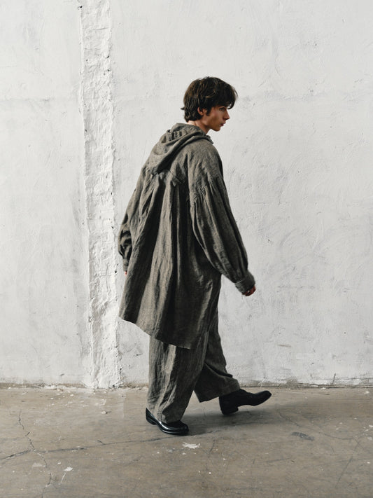 25春夏 冷染丝麻浅褐色藤条格纹连帽多褶风衣