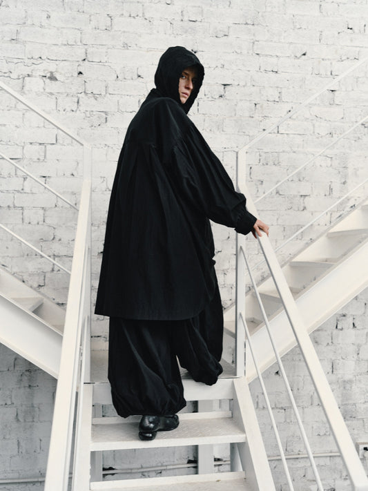 25春夏 水洗丝棉黑色连帽多褶风衣
