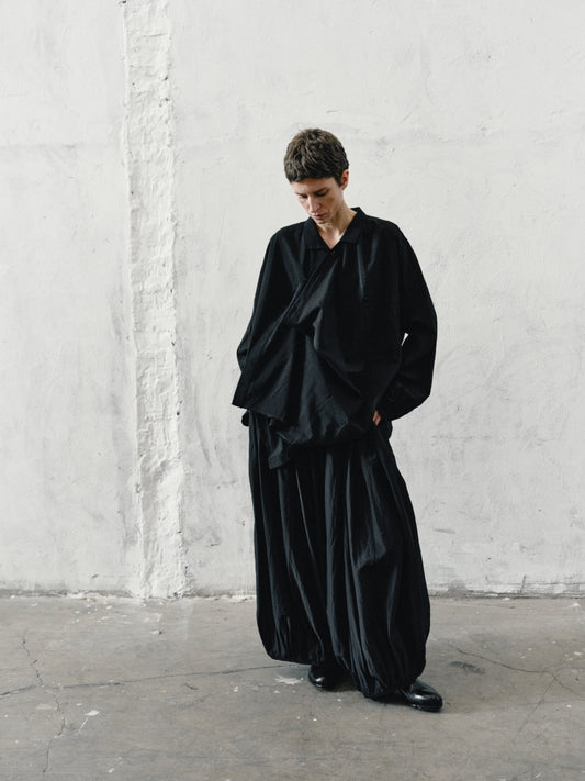 25春夏 水洗丝棉黑色多褶阔腿长裤